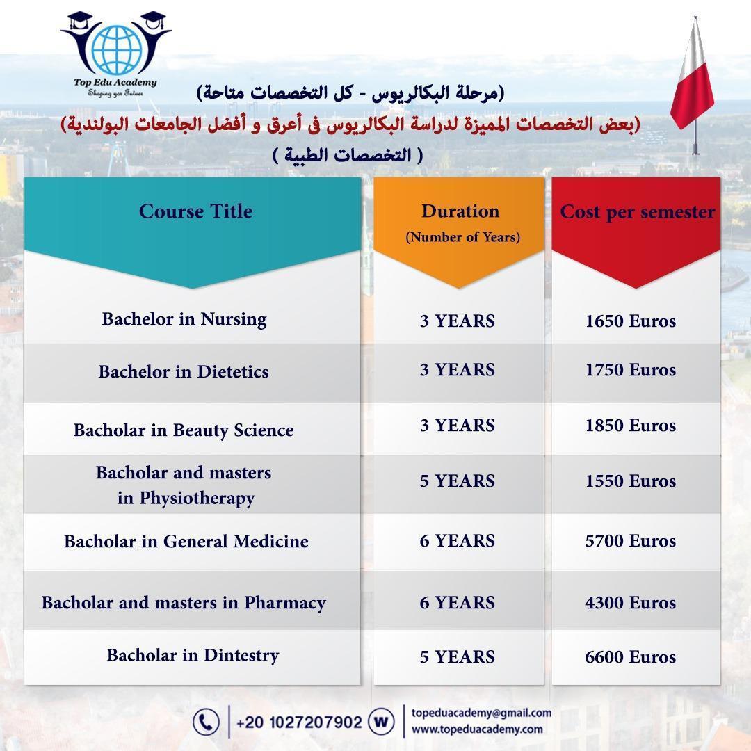 - من أكثر التخصصات طلبًا للتوظيف في أوروبا بكالوريوس التمريض Nursing باللغة الإنجليزية يبدأ من 3000 يورو، و 3600 يورو للماجستير. وممكن التقديم على طب بشري بعد التمريض.